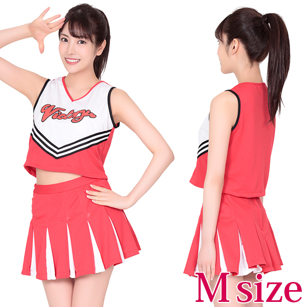 青空の下、元気いっぱいに応援!フロント部分に「VICTORY」の文字プリントが入った、チアガールのコスプレ衣装。ノースリーブのトップスと、レッド×ホワイトのミニスカートがセットになった、セクシー&キュートなコスチュームです。