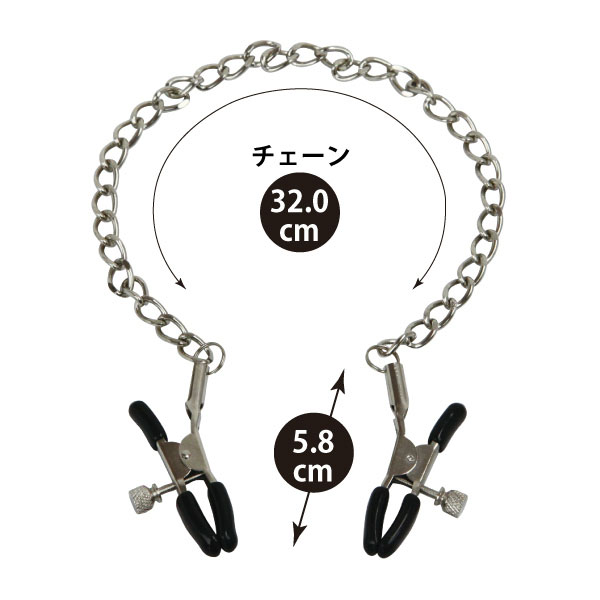 ネジで強弱の調整が可能!2つのクリップを1連チェーンで繋いだ、クールな乳首クリップ。乳首を挟む部分が柔らかなゴムで出来ている為、肌を傷付ける事なく安心してお使い頂けます。挟む強さを変更できるネジ調整式ですので、初めての方でも適度な「痛気持ちいい」快感を楽しむ事が出来ます。SMプレイの幅が広がる、乳首責め用ボディクリップです。