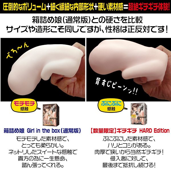 あの箱詰め娘がハードになって帰ってきた!数量限定で再登場した、溝口リホの非貫通型オナホール。「もう少し硬いのがいい」という前作からのリクエストに答え、限定登場した今作。侵入するものを拒み続けるかのようにハードな質感で、細かいヒダを限界までビッシリ敷き詰めた内部構造。イラストやホールのディテールなど、視覚からも興奮を誘うギチギチオナホールです。