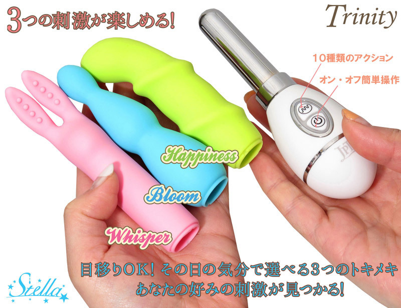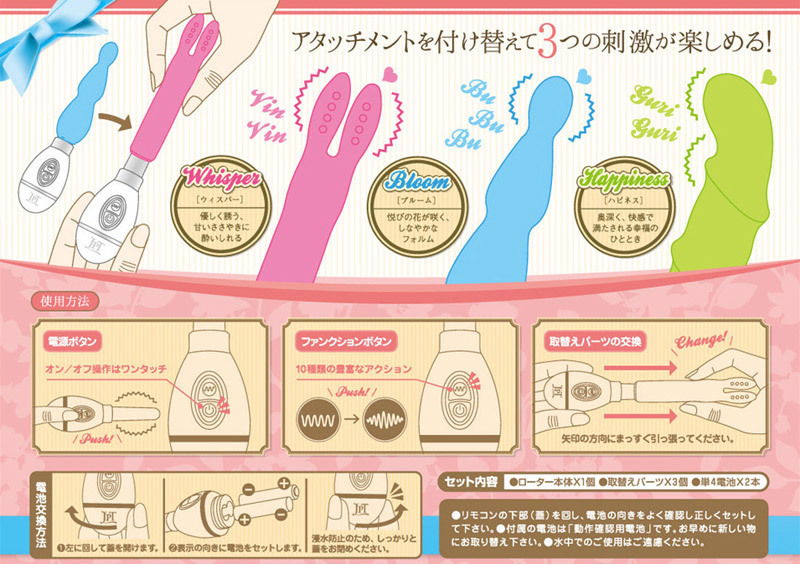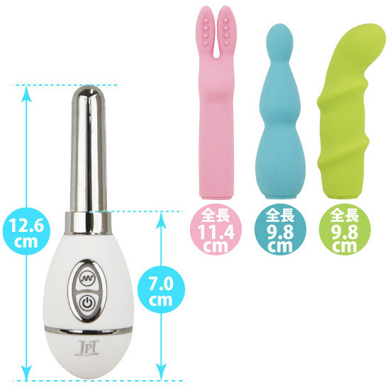 3つのキャップは、クリや乳首を挟んで刺激できるイボ付き耳のピンク、丸い先端と2つのくびれがほどよく括約筋を刺激するブルー、Gスポットに届きやすいカーブと螺旋のグリーン!もちろん、これらを被せなくても遊べます。