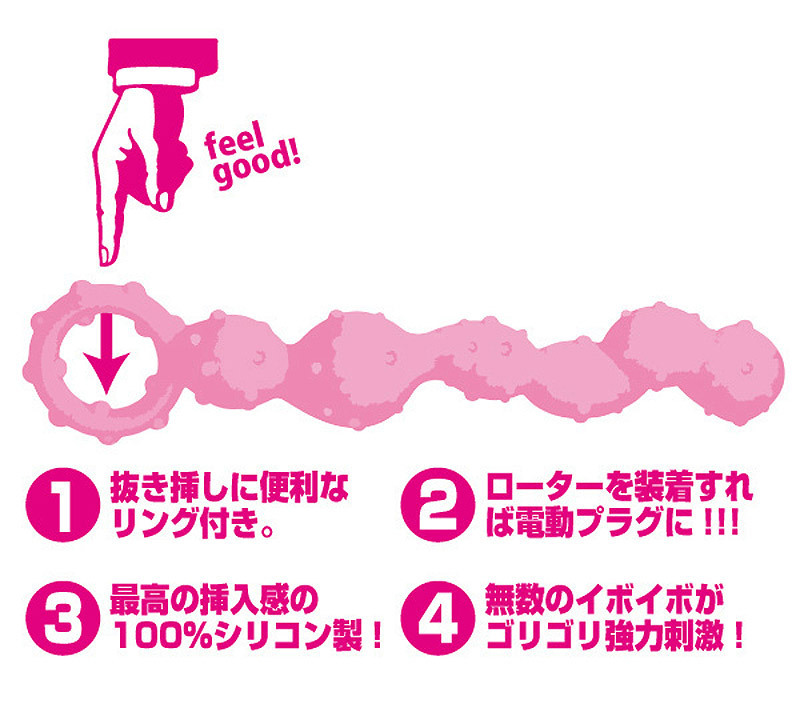 ●肌にやさしい100%シリコン●奥まで届くロングサイズ●入門者でも難なく挿入できるスリムボディ●出し入れしやすいリング付き●無数の突起とうねる形状が刺激的●お手持ちのローターをリングに装着すれば電動プラグに変身。