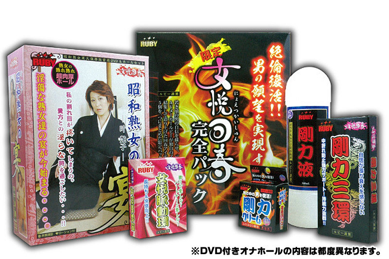 エロDVD付属で熟女の名器が楽しめるアソートオナホールに、血流をよくする成分シトルリンを配合した「剛力」、滋養強壮効果のあるガラナ&ムスク入りのローション、3点締めで勃起を助けるコックリング、パートナーを快感責めにできる電動コックリング、以上5品を詰め込んだ豪華なボックスセットです。
