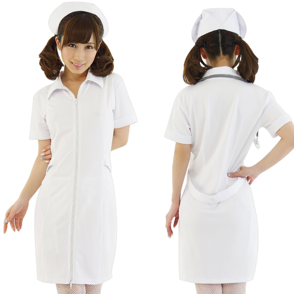 ●男女ともに憧れる定番衣装●清潔感たっぷりの純白タイプ●しっかり襟付きの半袖ワンピース●フロントジッパーで着脱カンタン●本格的なナースキャップ付き。