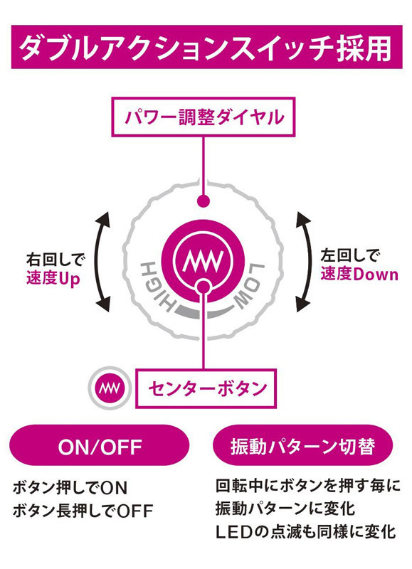 ●細長くなった可愛らしいピンクボディ●ヘッド径は45mmで前作「ピンクデンマ2」と同サイズ●ダイヤルとボタンが一体化したWスイッチ搭載●無段階の強弱コントロール●10種類の多彩な振動パターン●中央ボタン押しで電源ON/長押しでOFF●ダイヤル右回しで加速・左回しで減速●稼動中ボタンを押す度に振動パターン&LED点滅が変化。