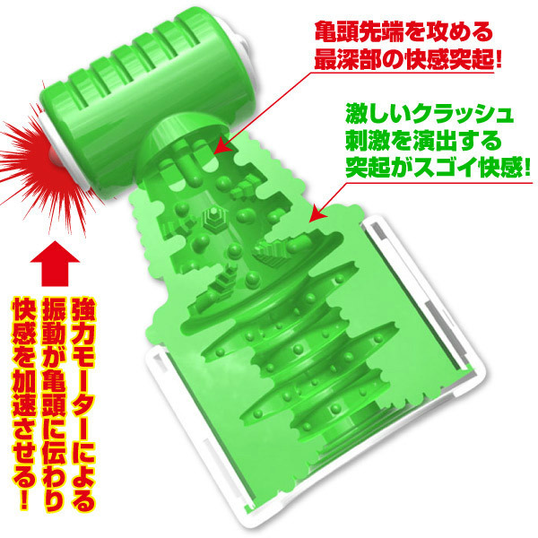 ●グリーンカラーのTYPE02「クラッシュ」●ソフトシリコンの入口が優しくホールド●高刺激のピラミッド型突起●尿道責め突起を最奥に配置●先端に強力モーター搭載●振動パターンは12種類。