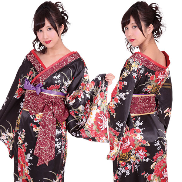 色っぽくも凛と着こなす和風スタイル♪豪華絢爛な花魁風のロング着物コスチューム。●しっとりとした黒ベースの華やかな和柄●ざっくり背中魅せの花魁風●裾はフィッシュテールデザイン●簡単着付けの作り帯&帯ひも付き。衣紋(えもん)を大きく抜いたセクシーな背中魅せにドキドキ!花魁着物のように豪華な和柄を取り入れたオトナ系の着物コスチュームです。