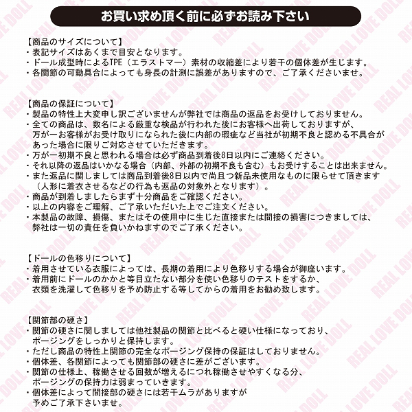 ●ウブさが残る愛くるしい顔立ちの優花ver●髪型:前分けワンカールボブ(ブラウン)●身長145cm・体重29kg●B:80cm・W:51cm・H:75cm●小柄なスリムボディ●対応服は女性用Mサイズ●パイズリできちゃう柔らかくて豊満なバスト●ホール装着スリットあり●アナルはドールに直接成型されたヒダ構造●同シリーズ全てのドールがオーラルプレイ可能。