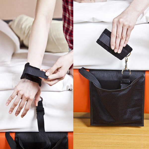 ラブホテルオーナー様の声に応えて開発されたSMグッズ!使用後の枷を各ポケットに収納できる気配り仕様なので、設置したままでも見た目すっきり!ベッドメイキングの邪魔にもなりません。