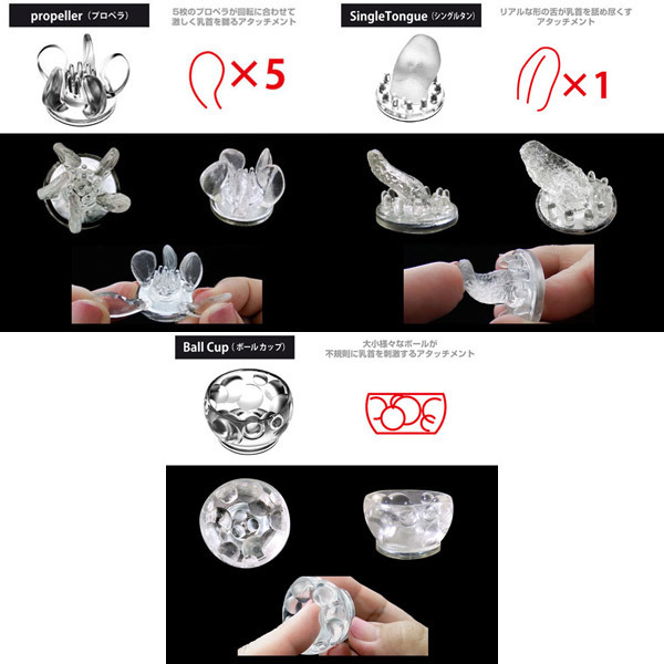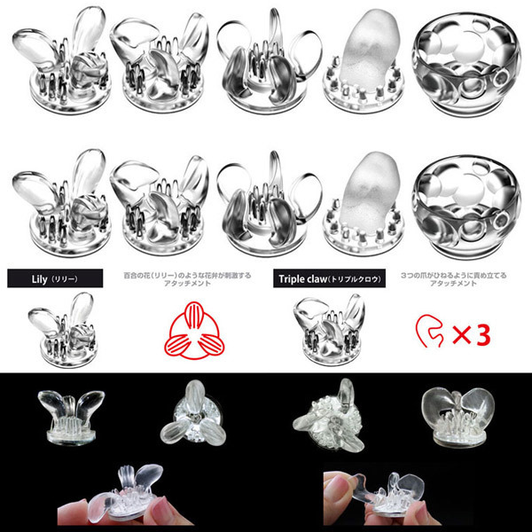 ●お肌に優しいソフト弾力素材●本体付属と同形状の5種×各2個●リリー:百合の花びら風●トリプルクロー:3つのツメ型●プロペラ:中央ブラシ+5枚ヒダ●シングルタン:リアルなザラザラ舌●ボールカップ:大小ボール●簡単着脱のマグネット式。