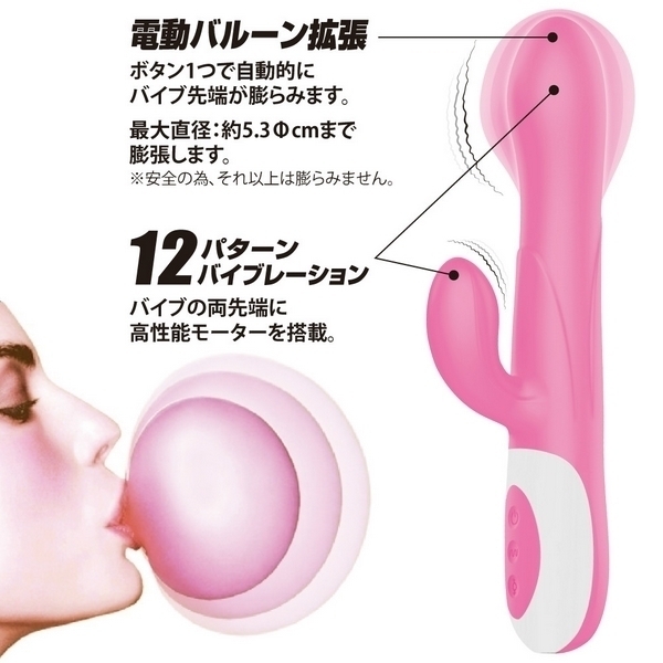 ボタンひとつで先端が風船のようにプクーッと最大5.3cmまで膨張!さらに、12パターンのバイブレーション機能で多彩な振動刺激も楽しめます。