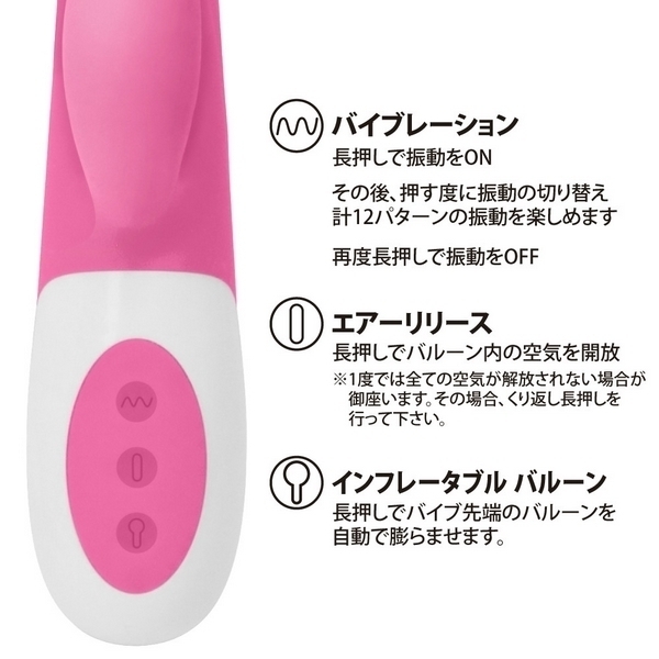 ●自動で膨らむ先端バルーンモデル●全長24.5cm、通常時の最大径3.6cm●バルーン機能使用時の最大径5.3cm●エアリリース機能で内部空気を解放●ヘッド&クリバイブに12種振動搭載●手触りの良い高品質シリコンボディ●丸洗い可能な生活防水仕様で衛生的●タフなUSB充電式(専用コード付属)。