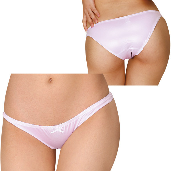 ●優しいパールピンクカラー●光沢感のあるフェリカ生地を使用●フロント:小さなリボン付き●クロッチ部分にスリットあり●お尻がちょっぴりはみ出すハーフバック●ウエスト&脚周りはしっかりフィットのゴム仕様●日本製・Mサイズ。