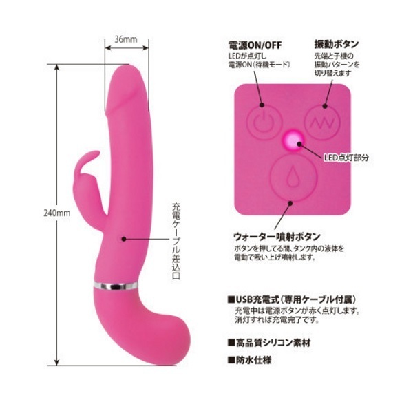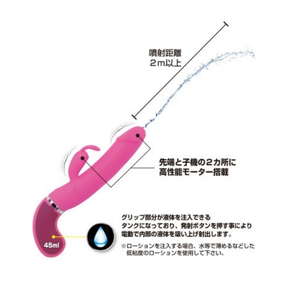 ●ピストルのようなシルエット●高品質なシリコン素材を採用●滑らかボディで挿入感も抜群●先端&子機に高性能モーター●12種類の多彩な振動パターン●ウォータースプレー機能搭載●液体45mlをタンクに注入可能●ボタンを押すと先端から噴射●液体の噴射距離は約2m以上●生活防水仕様で丸洗い可能●電源はUSB充電式。