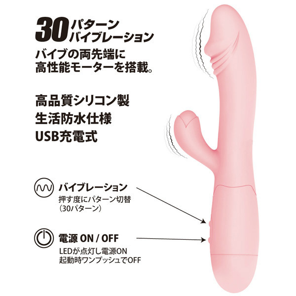 ●丸みのある淡いピンクボディ●安心安全な高品質シリコン素材●フィットする程よいサイズ感●リアルなカリと蕾型クリバイブ●亀頭と子機先端に高性能モーター●30種の振動パターン機能を搭載●簡単メンテナンスの生活防水仕様●USB充電式(専用コード付属)。