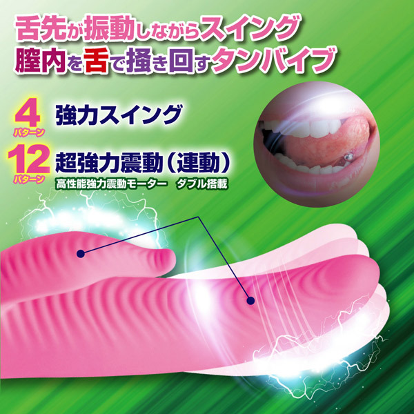 ●肌触り抜群の高品質シリコン●舌モチーフの竿&クリバイブ●凸凹加工でザラザラ感を再現●4パターンの高速スイング機能●高性能強力モーターをWで搭載●12種の振動が竿と子機で連動。