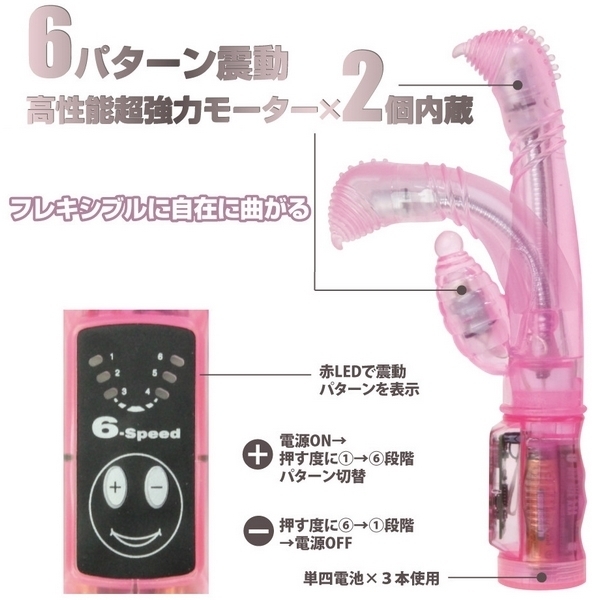 ●先端はドリル状のくちばし風フォルム●本体中央に角度を固定できる中芯入り●竿とクリバイブ両先端にモーター搭載●6種類のバイブレーションパターン●肌触りの良い高品質エラストマー製。