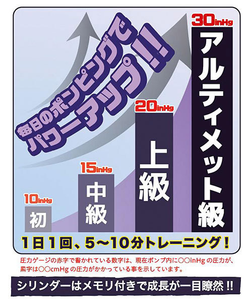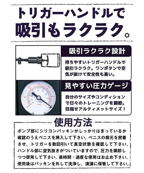 1日1回のポンピングでアルティメット級にパワーアップ♪簡単トレーニングの手動式ペニス増大ポンプ。●吸引レベルが解る圧力ゲージ付き●ラクラク吸引のトリガーハンドル●成長実感のメモリ付きシリンダー●密着感を高めるシリコンパッキン●ワンボタンで圧力解放の安全設計。しっかり密着して吸引!自身のサイズやコンディションにあわせて調節できる手動ポンプ式のチントレグッズです。
