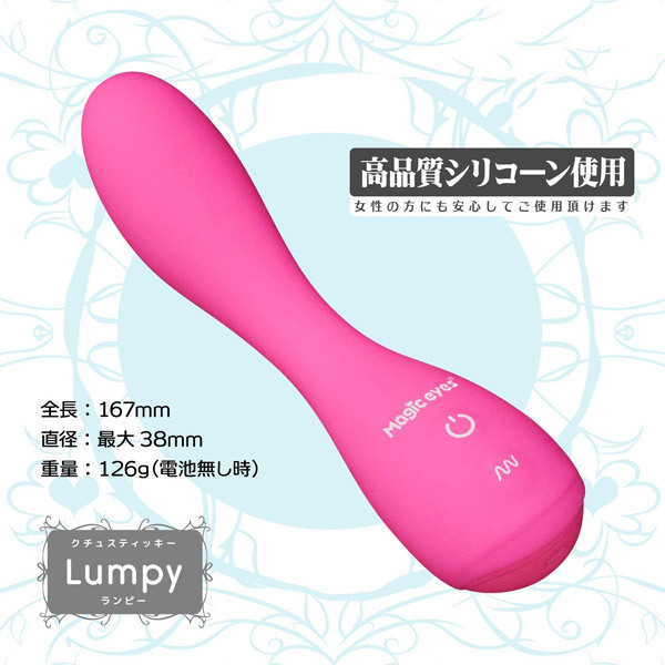 マジックアイズの人気シリーズ「クチュスティッキー」に、柔軟ネックの「Lumpy(ランピー)」タイプが登場!大きく膨らんだ柔軟な先端がフィットして、奥までしっかり振動を伝えるバイブレーター。