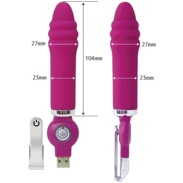 ●三連リングの凹凸ヘッドデザイン●挿入部長10.4cm、最大径2.7cm●初心者にもお勧めの程良いサイズ感●肌触りの良い高品質シリコンボディ●多彩な20パターンの強力振動を搭載●本体と端子が一体化したUSB充電式●キャップを外して本体ごと充電可能。