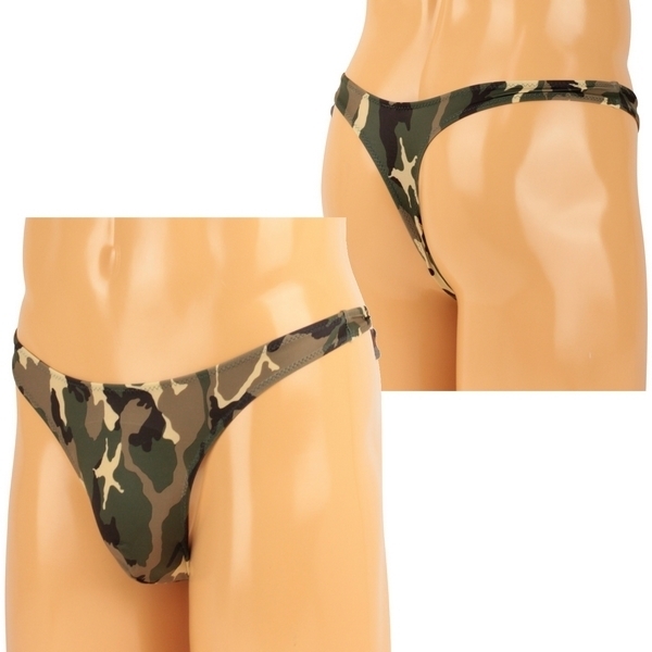 カジュアルな迷彩柄がボディを彩るメンズ下着!フロントはゆったり大きめに、バックはキュッと引き締めたTバックでセクシーな仕上がりです。