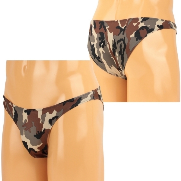 カジュアルな迷彩柄がボディを彩るメンズランジェリー!フロントはゆったり大きめに、バックはスッキリとしたハーフバックでセクシーな仕上がりです。
