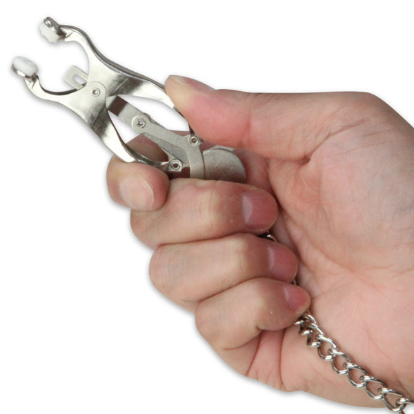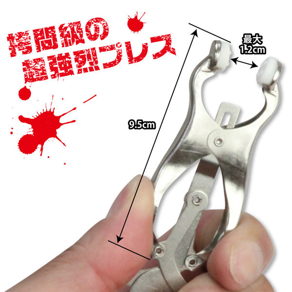 両乳首に拷問級の超強烈プレス!ハードな乳首責めが楽しめるスチール製のチェーン付きニップルクリッパー「ティッツクラッチ ストロングプレス」。超ハードプレイを楽しめるSMグッズ!プレス刺激に加え、2つのクリップを繋ぐチェーンの重みによる負荷で痛気持ち良さも増幅!クリップの開閉幅は最大1.2cmです。先端部分にはラバー加工が施されていますが、とにかく強力な締め付けですのでご注意を。