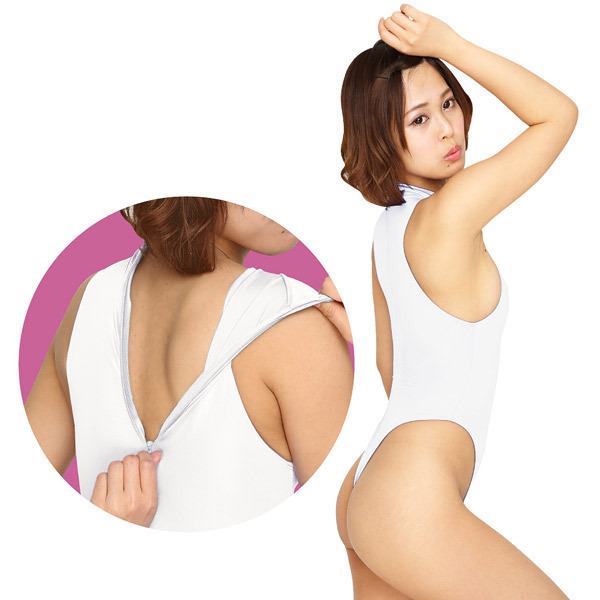 ●光沢ホワイトカラーのレオタード●水着等で使用されるウェット生地●伸縮性がありボディにフィット●背中ファスナーのハイネック仕様●腰まである深いハイレグデザイン●後ろ姿は露出度の高い大胆Tバック●日本性ならではの丁寧仕上げ。