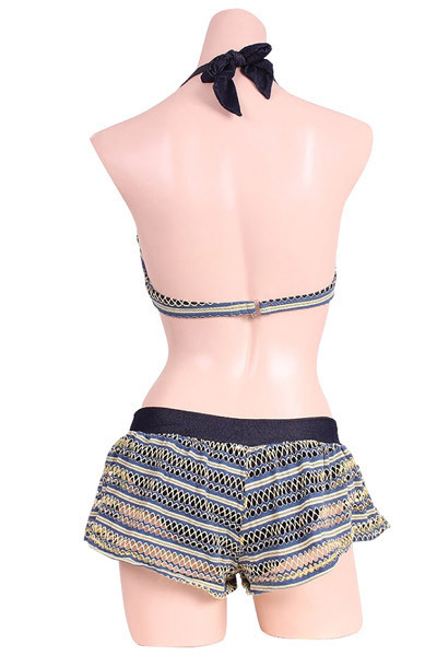 デニム風合いのストレッチ生地と2色使いのネットボーダー生地を重ねてレディだけどカジュアルなバランスが素敵。