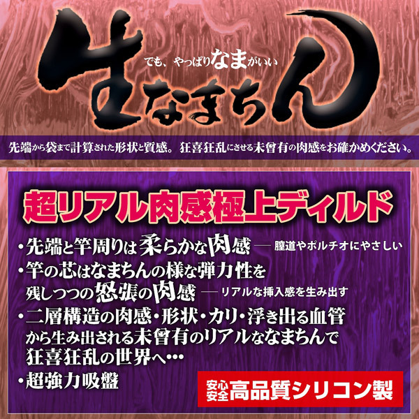 やっぱりナマがいい♪先端から袋まで計算された超リアル肉感の極上ディルド「生なまちん」。先端と竿周りは膣道やポルチオにやさしい柔らかな肉感、竿の芯はなまちんの様な弾力性を残しつつもしっかりとした二層構造でリアルな挿入感を生み出します。強力吸盤付きで床や壁に固定可能!安心安全の高品質シリコン製。『なまちん』を見事なまでに再現した挿入感をぜひご堪能ください。