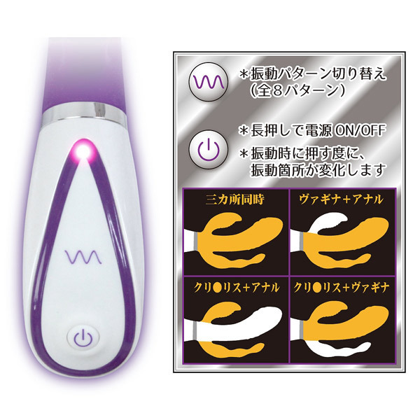 Cスポット、Gスポット、アナルの3ヶ所それぞれに強力な振動モーターを内蔵!全8パターンの振動切り替えと振動箇所の切り替えができるので、お好きな組み合わせで様々な刺激を楽しめます。