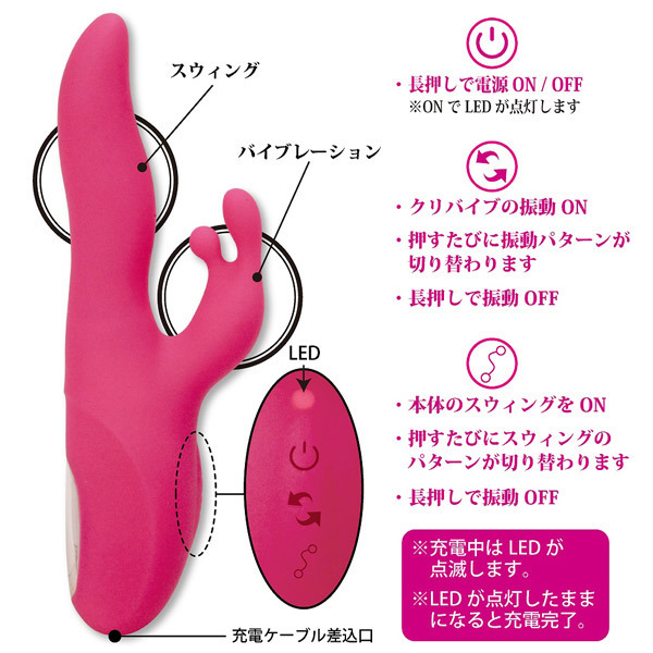 一定方向へのシンプルなスイングから、左右へ不規則に回転するダンサーの腰のようなクネリ感のある動きまで、6種類の回転パターンを搭載!Gスポットを押し上げるように膣全体をかき回す快感スイングで、かつて無い絶頂へと導きます。