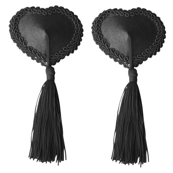 上品な光沢感のサテンを美しい装飾で縁取ったハート型ニップルと、ゆらゆら揺れるタッセルを組み合わせたゴージャスなデザインは、ショータイムやナイトパーティーにも最適です。