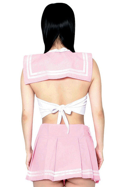 マイクロ丈のプリーツスカートと、背中で結ぶタイプのストレッチトップスの2点セット♪大きく開いた背中や短めのスカートから覗くヒップなど、後姿にドキッとするエロ可愛いセーラーコスプレです。