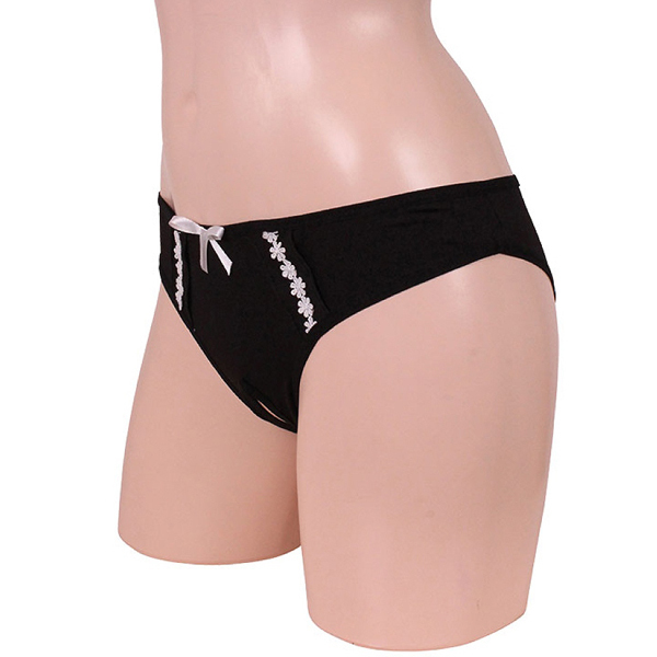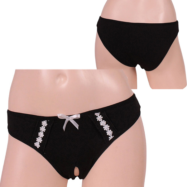 ピュアそうに見えて実は小悪魔!アダルトな仕掛けにドキッとする穴あき仕様のフルバック♪クロッチ部分に切れ込みが入った黒のフルバックに、リボンと小ぶりな花の刺繍を飾り可愛さをプラスした小悪魔女性のためのフルバックです。