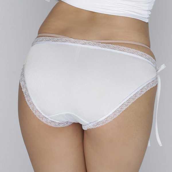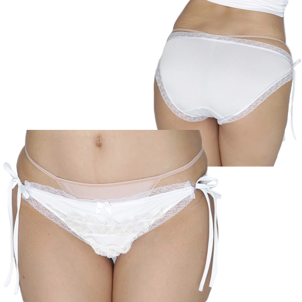 パートナーに可愛く見られたい夜に、光沢生地をフリルレースで飾った日本製フルバック(白)。2段にあしらったレースで愛らしく見せつつ、サイドの紐結びで甘く誘惑するレディース用の紐ショーツです♪