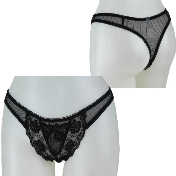 繊細な花柄レースでエレガントに飾る極薄生地の日本製Tバック(黒)。生地から透けて見える素肌と華やかな刺繍に大人の色気を感じる一枚♪少し大きめサイズ。