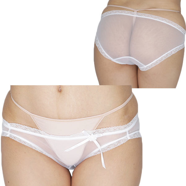 穿いているのに穿いてないような透け感で誘惑する極薄生地の日本製フルバック(白)。フルバックの縁に白レースをあしらいフロントに同色のリボンを飾ることでフェミニンに仕上げたデザイン!素肌が透けて見えるシースルー生地を使うことでセクシーさをプラス♪