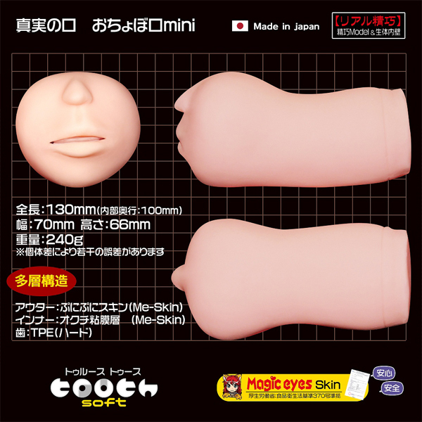 ふわっと柔らかい!元祖「真実の口」よりミニサイズが登場!未経験のような優しさと下手くそさを再現した日本製の非貫通オナホ♪手に馴染みやすいハンドサイズで喉の奥行は10cmと短め。外側と、とろけるようなバキューム感を与える内部の舌や喉ちんこに加え、先端部分を刺激するTPE素材の歯まで本物に違わぬ精巧な作り。ビジュアル、実用性どちらもこだわりたい方に!ローション付