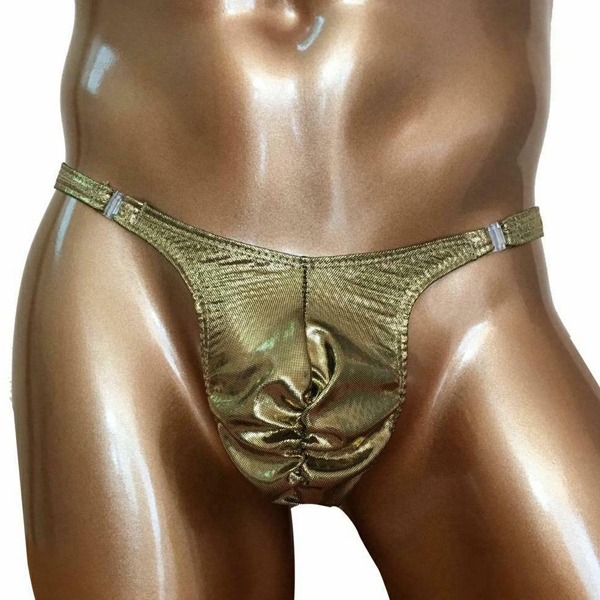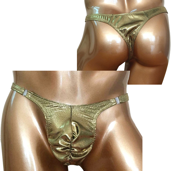 男の象徴を金に輝かせるゴージャスなメンズ用Tバック(ゴールド)。引き締まったお尻と男の象徴を強調する!ゴールドカラーが目を惹く男のためのセクシーTバック。優しく手洗い、または網ネットに入れて洗濯してください