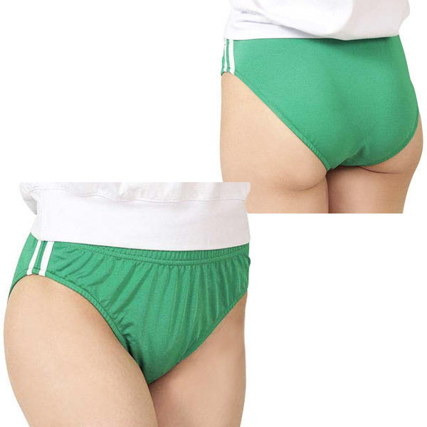 アニコス衣装や制服とも相性抜群♪人気のコスプレ単品シリーズに緑色が登場しました!深めのハイレグカットと伸縮性の良い生地が程よいフィット感を生み出す♪両サイドに白ラインを2本施した本格派デザインの可愛いブルマです。