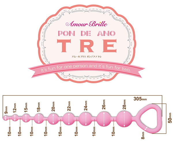 女性のためのシリーズ「アムールブリエ」から新たに「ポンデ アノ」が登場!あの有名なもちもちドーナツのような形状が可愛いアナル専用グッズ。100%のピュアシリコンを使用した肌に優しい質感!初心者さんにも挿入しやすい先端9mmから中〜上級者の方までが楽しめる最大径28mmまでの9連ビーズで仕上げています。
