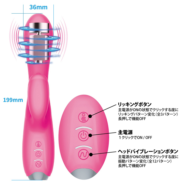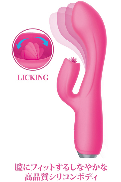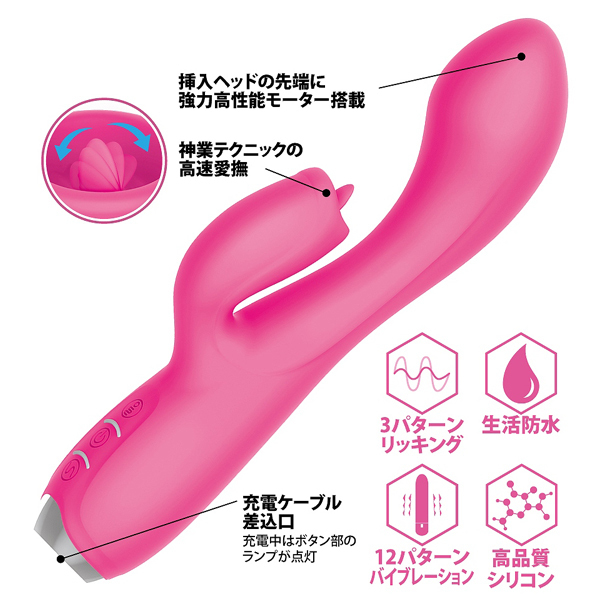 クリを激しく舐めながら幅広ヘッドでGスポを捉えて徹底刺激♪高性能モーターによる内まで響くような快感振動が全身を駆け巡る!素材には高品質シリコンを採用、密着形状で膣内にぴったりフィット!12パターンの振動と3パターンのリッキング(舐め)が味わえます。