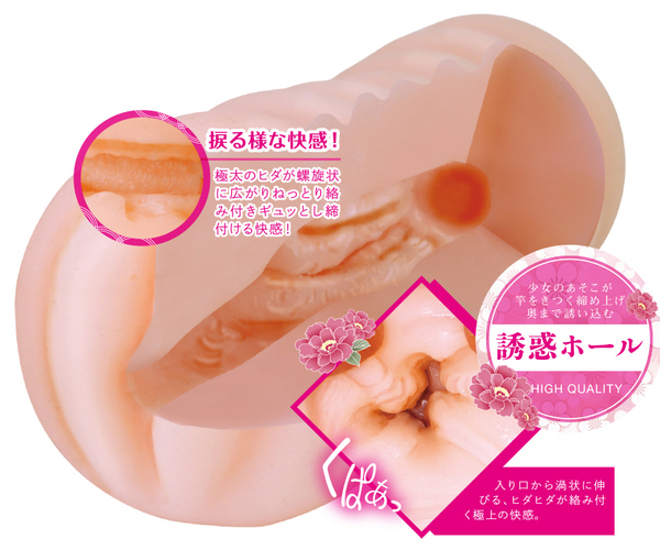いやらしく濡れるあそこが竿をキツく締め上げて奥まで誘い込む誘惑オナホール「誘惑少女」。愛液たっぷりの柔肌膣内でドキドキのエッチ体験!ぷっくりすじまんの入り口から渦状に伸びるヒダヒダが絡み付く極上の快感!極太のヒダが螺旋状に広がり、ねっとりと絡み付いてギュッと締め付けます。