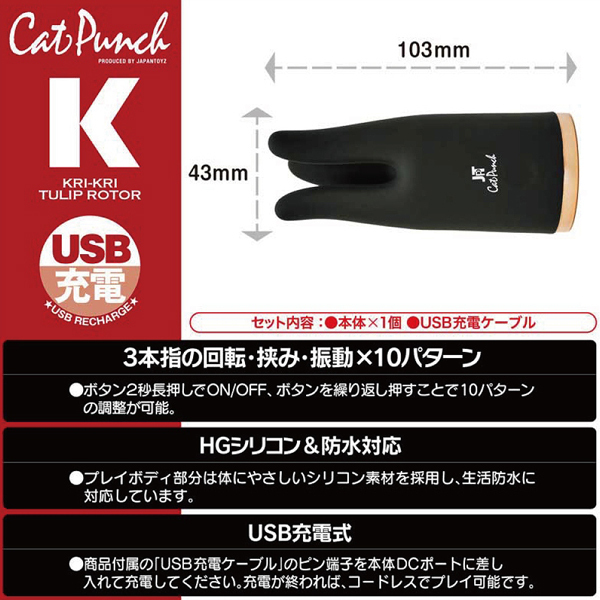振動する3つの突起が敏感な部分をこねくり回す!新感覚の刺激が楽しめるブラックカラーのUSB充電式ローター。摘まんでネジったり、3つの指を中に挿入してかき回してみたりと、選べる技は10種類!テクニシャンな指技が味わえる特殊形状のシリコン製ローター。お手入れしやすい生活防水式
