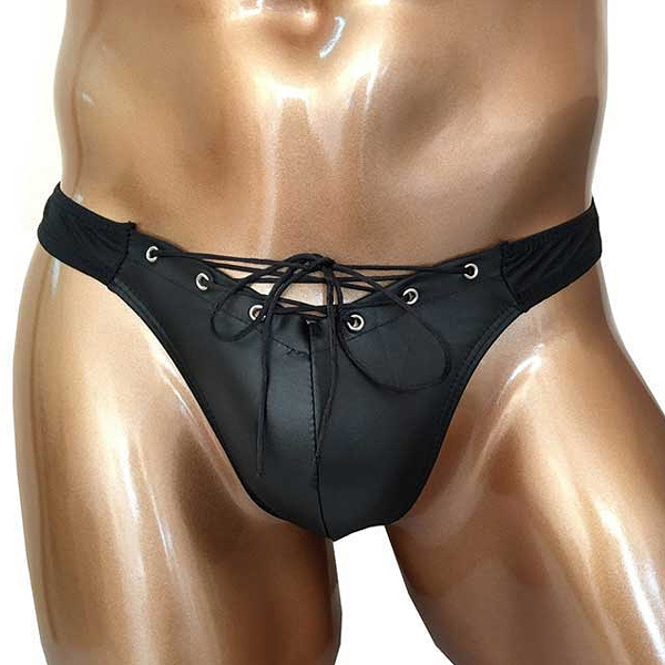 マットな光沢感が魅惑的!立体縫製で包み込むお洒落な男性用Tバック。ハトメ金具に紐を通しレースアップしたスタイリッシュなデザイン♪バックはタンガデザインで、引き締まったお尻をアピールします。ブラックカラー、フリーサイズ