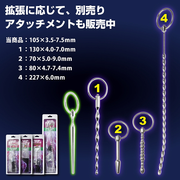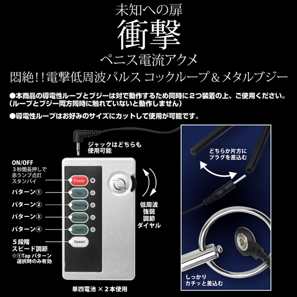 下半身に走る電撃ショック!大人気「エレクトリックショックシリーズ」から、低周波パルスの脈打つ刺激がクセになるコックループ&メタルブジー。5段階のスピード&4種類のパターンから選べる電撃低周波刺激♪悶絶必至の電流刺激に未知なる扉が開かれる!他にも拡張に応じて使えるアタッチメントを多数販売中◎ループはお好きなサイズにカットして使用していただけます。