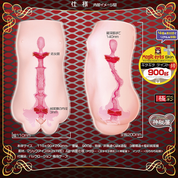 極彩の純潔膜+3層構造を搭載した人気商品「ろりんこ処女宮(バルゴ)(b23055)」に高刺激なハードが登場。ずしっと重い900gの肉厚ちっぱいボディを、美肌コーティングで覆い高耐久化!5mm厚の純潔膜には3mmの穴を空け、挿入を硬く拒みます。素材にはAg+抗菌仕様のマジックアイズスキンを使用!4種の素材で締め付けと粘膜感が味わえる非貫通オナホ。ケース付