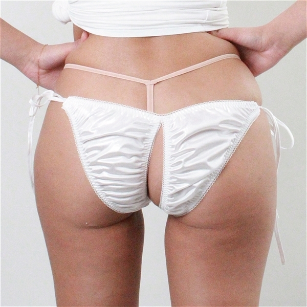 トップページ > ランジェリー > オープン ブラ・ショーツ(穴あき) > 光沢が有り肌触りの良い生地にレース付き脇ヒモ股ワレFB Lサイズ ホワイト