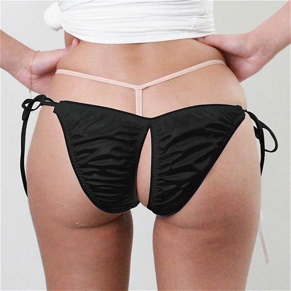 トップページ > ランジェリー > オープン ブラ・ショーツ(穴あき) > 光沢が有り肌触りの良い生地にレース付き脇ヒモ股ワレFB Lサイズ ブラック