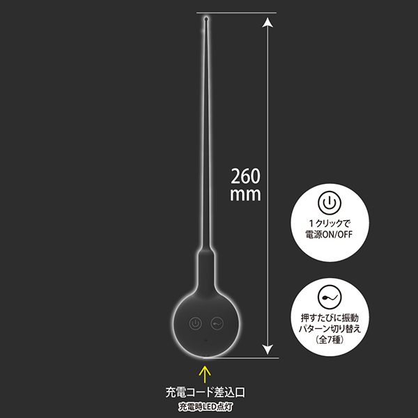 7種類の振動パターンを搭載していてIPX6等級の防水性と静音設計が自慢♪コントローラー部分から尻尾のように伸びた触手みたいな部分がくねくねと曲がることで狙いたいところをピンポイントに責めたり刺激することができます!先端部分の太さは2mm、最大でも5mmという太さだから、尿道に挿入しての振動体験など他では味わえない刺激が楽しめます。